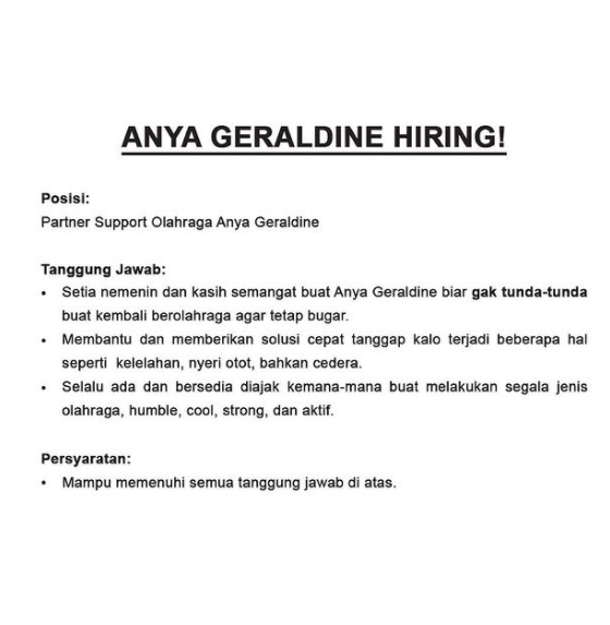 “ANYA GERALDINE HIRING! Posisi: Partner Support Olahraga Anya Geraldine” tulis Anya.